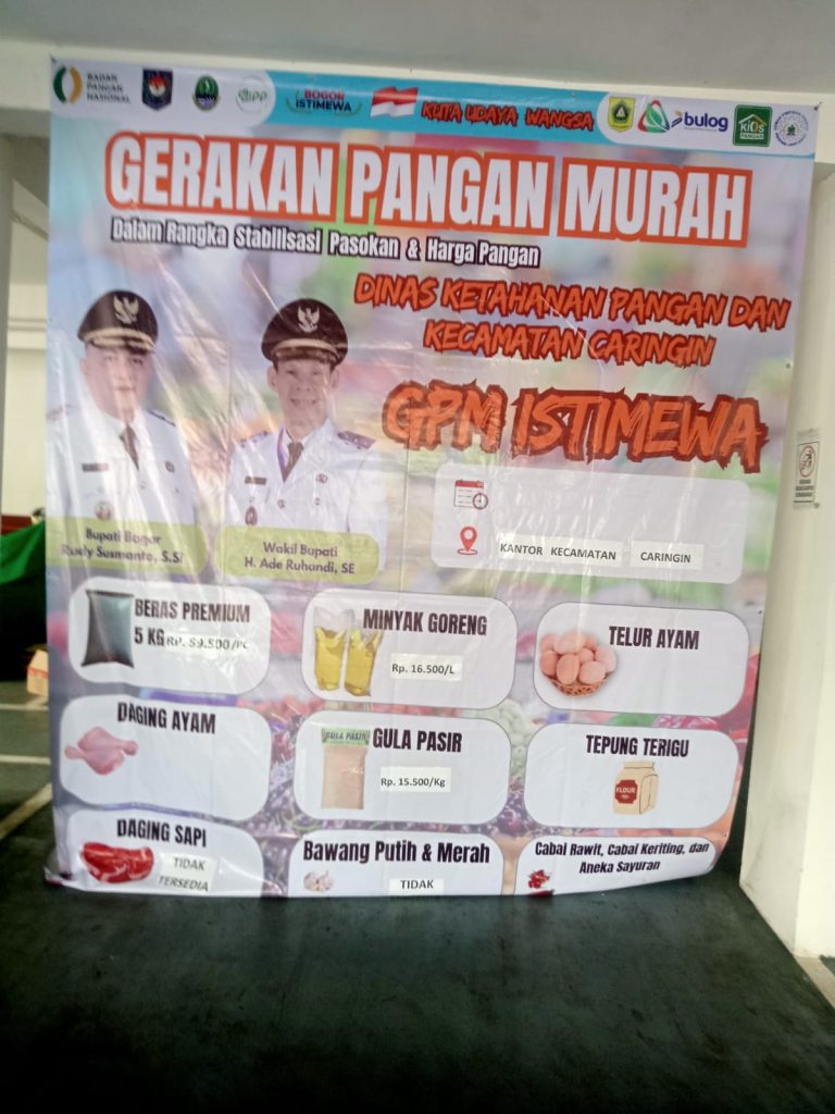 Liputan CS – Caringin – Dalam rangka menjaga stabilitas pasokan dan harga pangan, Dinas Ketahanan Pangan bekerja sama dengan Kecamatan Caringin menggelar Gerakan Pangan Murah (GPM). Kegiatan ini mendapat sambutan antusias dari warga, karena menyediakan lima bahan pokok dengan harga terjangkau, yakni beras, minyak goreng, daging ayam, telur, dan gula.